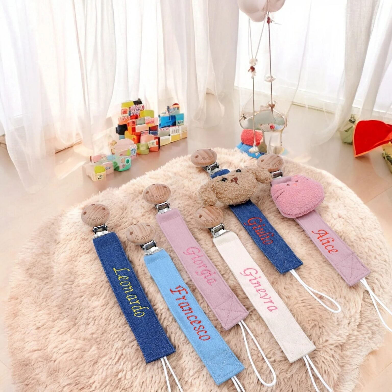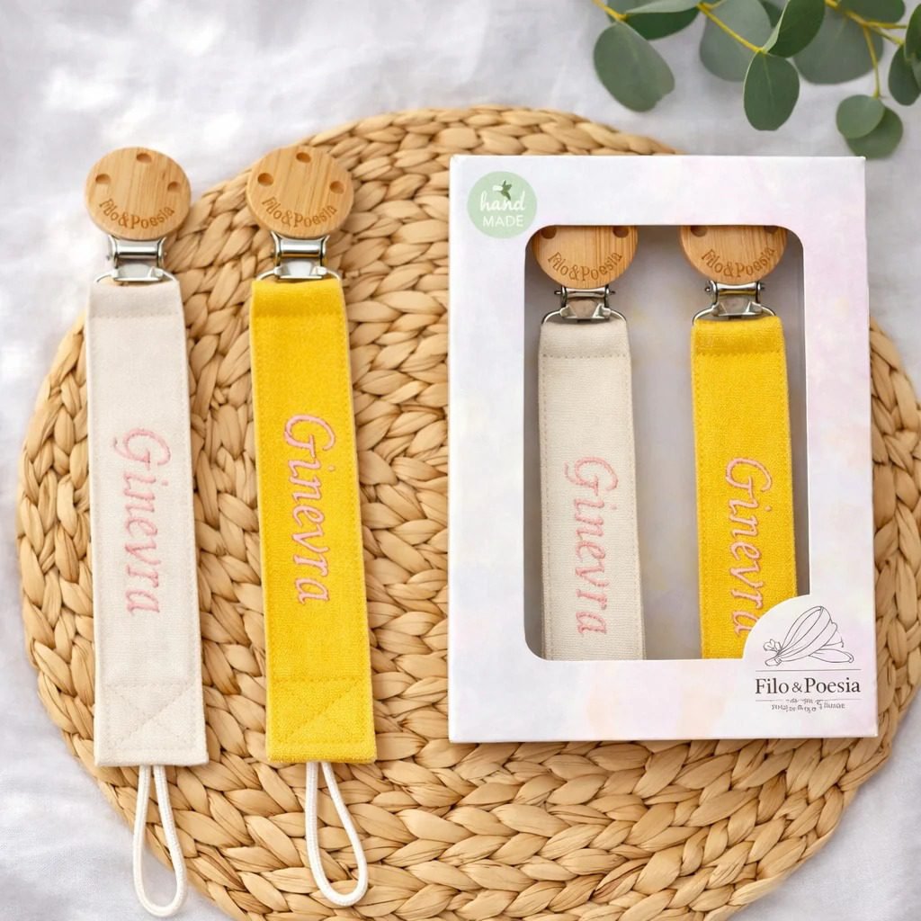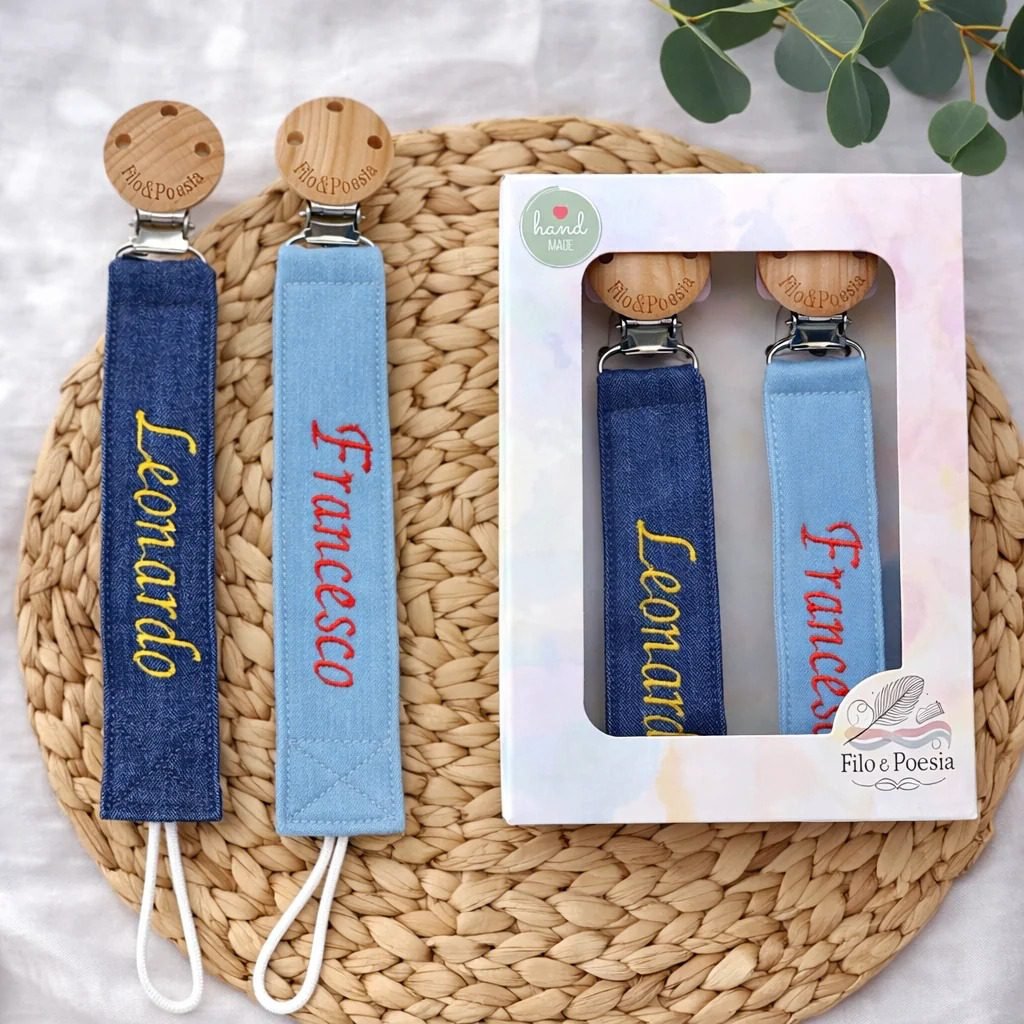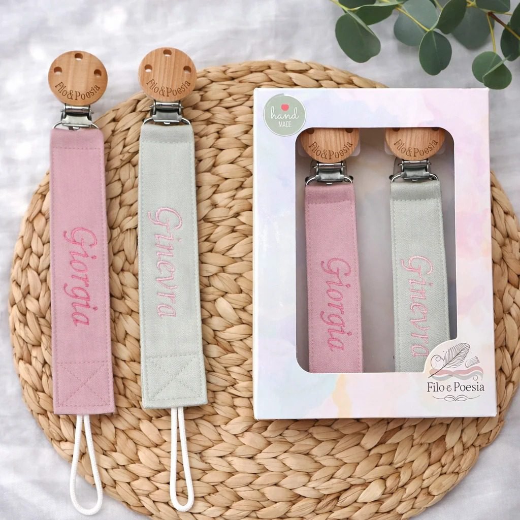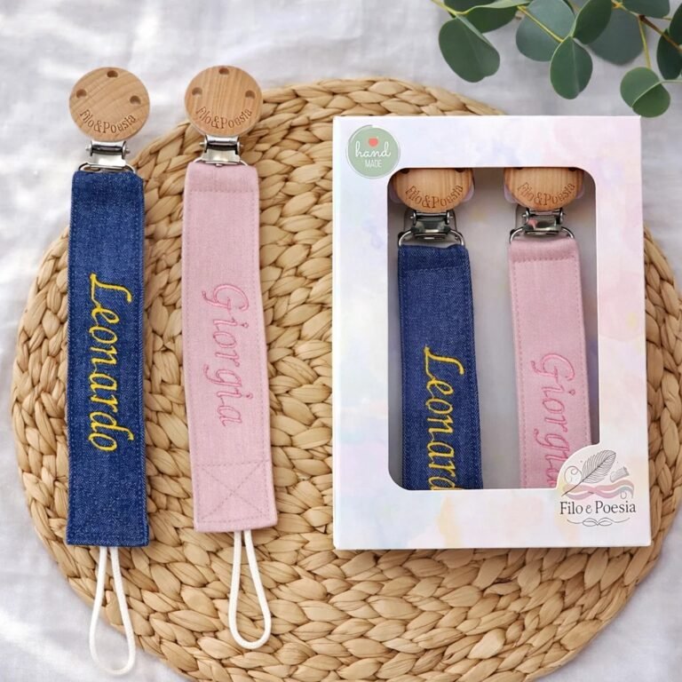 Il nome è ricamato artigianalmente, filo su filo. Non è una stampa che sbiadisce al primo lavaggio — è un ricamo che dura quanto il ricordo.