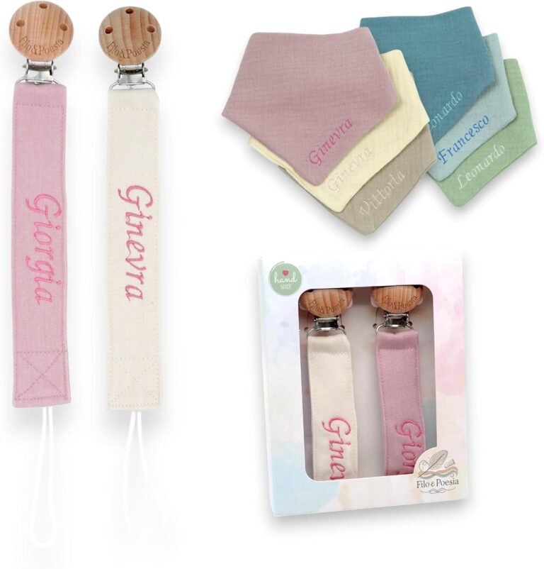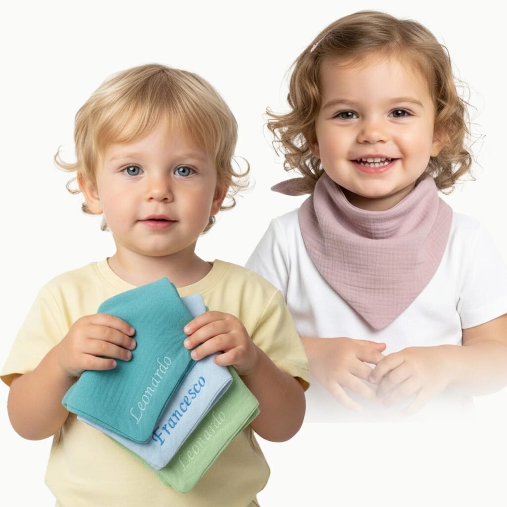 Lavabile in lavatrice, resistente all'uso quotidiano e disponibile in set da 3 pezzi coordinati. Perfetto come regalo nascita, battesimo o baby shower — arriva già confezionato.